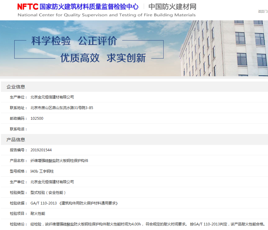 采用12mm防火板鋼柱包覆可達到防火4小時耐火極限,防火完整性與隔熱性能穩(wěn)定,有國家防火建筑材料質(zhì)量監(jiān)督檢測中心出具的防火板鋼柱包覆4小時耐火極限型式檢測報告。 可到中國建材防火建材網(wǎng)上查詢:http://www.fire-testing.net/ 查詢真?zhèn)危?/span>以下是我公司防火報告查詢結(jié)果頁面
